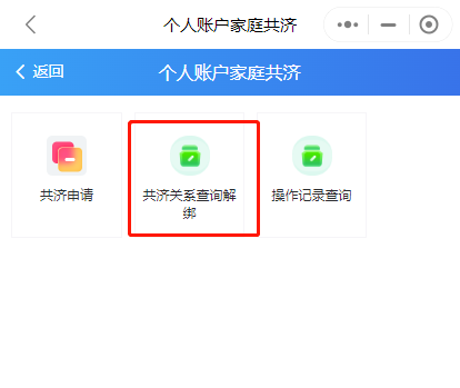 第四步:辦理完成后,可通過“家庭共濟(jì)”——“共濟(jì)關(guān)系查詢解綁”查詢綁定情況,“解除綁定”功能也可在此界面操作。