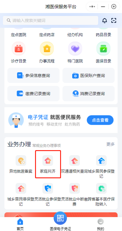 第一步:下載“湘醫(yī)保”App,或進(jìn)入“湘醫(yī)?!盇pp小程序,登錄后在首頁“業(yè)務(wù)辦理”中找到“家庭共濟(jì)”,點(diǎn)擊“共濟(jì)申請(qǐng)”。